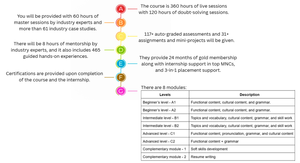 - The course is divided into 6 levels, i.e., level A1 is a beginner level, level A2 is an elementary level, level B1 is an intermediate level, level B2 is an upper-intermediate level, level C1 is an advanced level, and level C2 is a master proficient level.