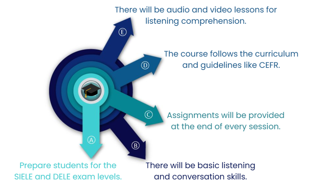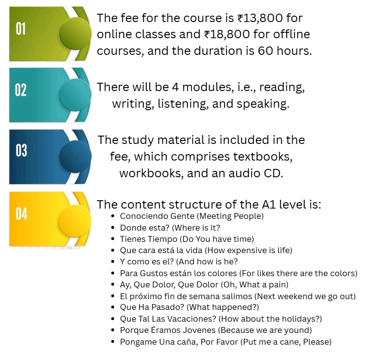 Course Details: Based on the DELE A1 syllabus. The fee of the course is ₹15,000 + taxes, and the duration of the course is 4 months, i.e., 64 hours. The details of the course are as follows: