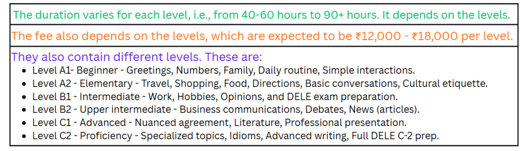Course: They provide many language courses, and among them, they also provide Spanish classes. Details are given below.
